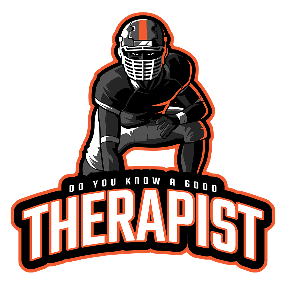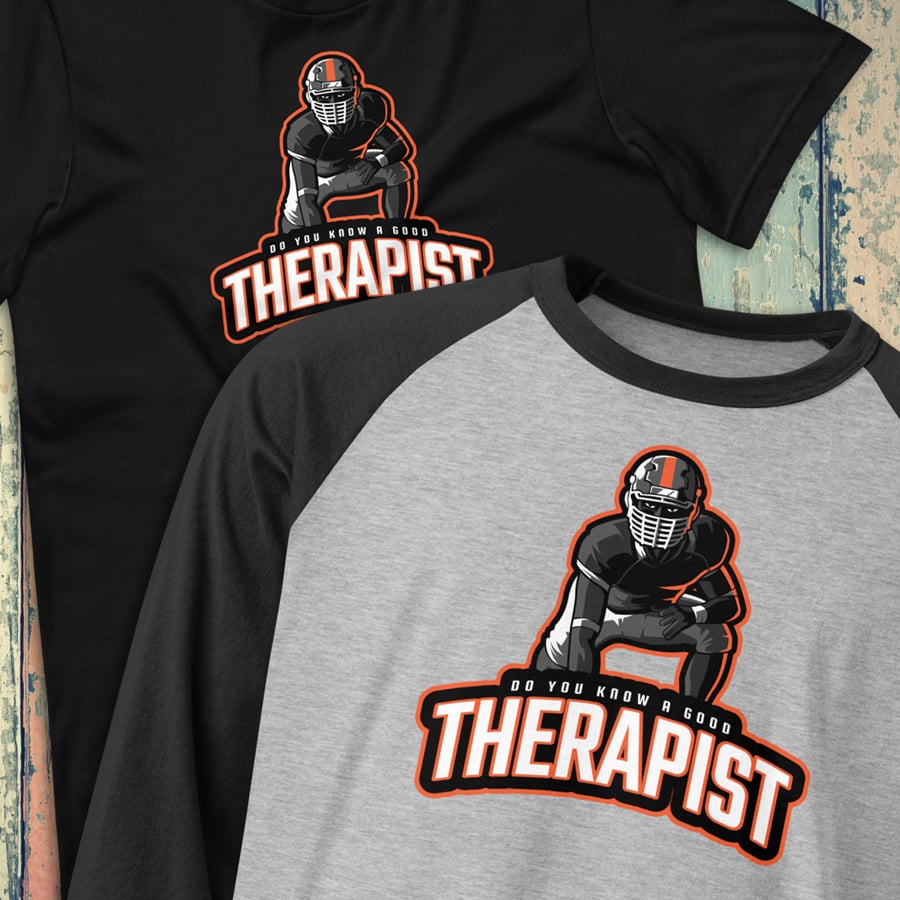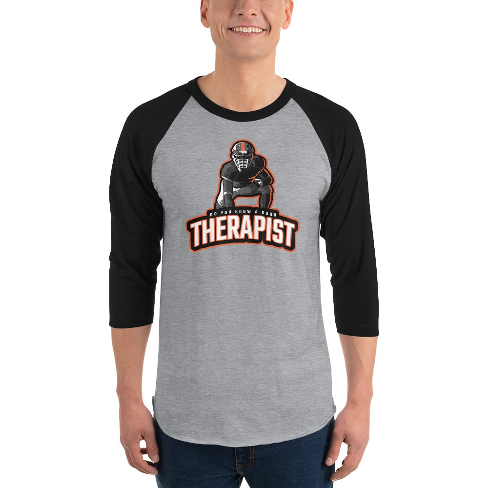 DO YOU KNOW A GOOD THERAPIST shirt. This shirt is part of Dave's EMO FOOTBALL line of stupid sports shirts. Available as either a t-shirt or a baseball (3/4 sleeve) shirt!