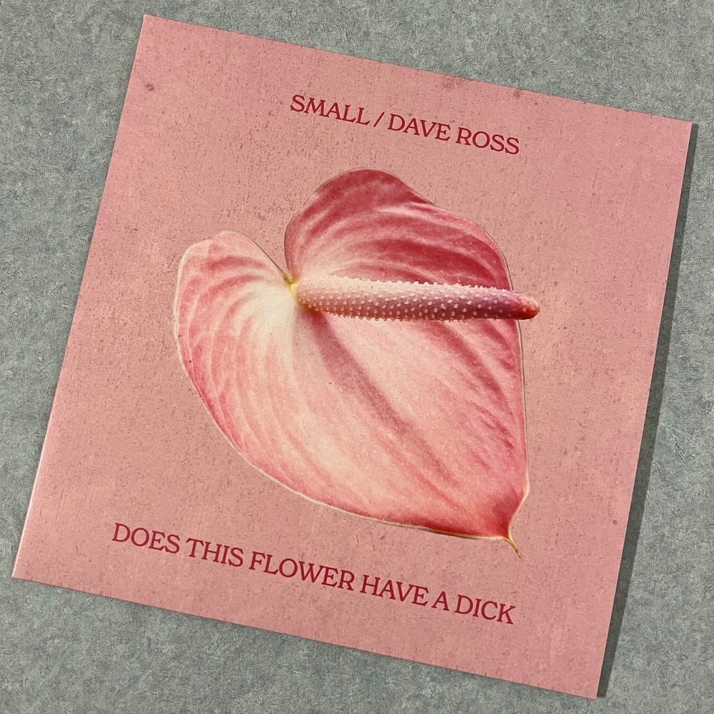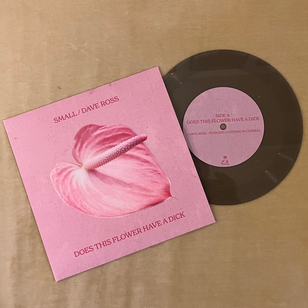 SMALL and Dave Ross's split EP "Does This Flower Have A Dick" on smokey grey round 7-inch vinyl in a full-color cardboard jacket.
